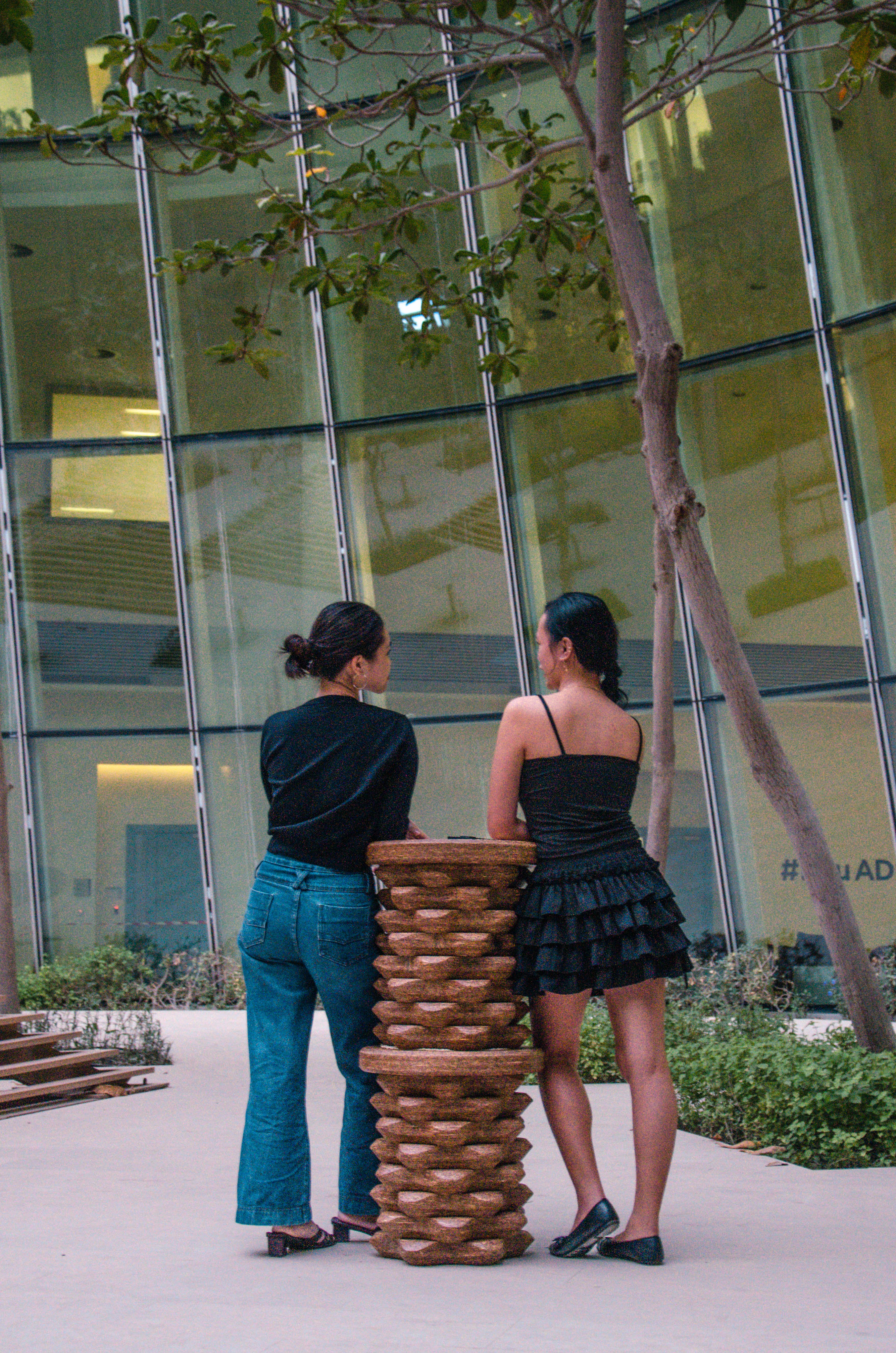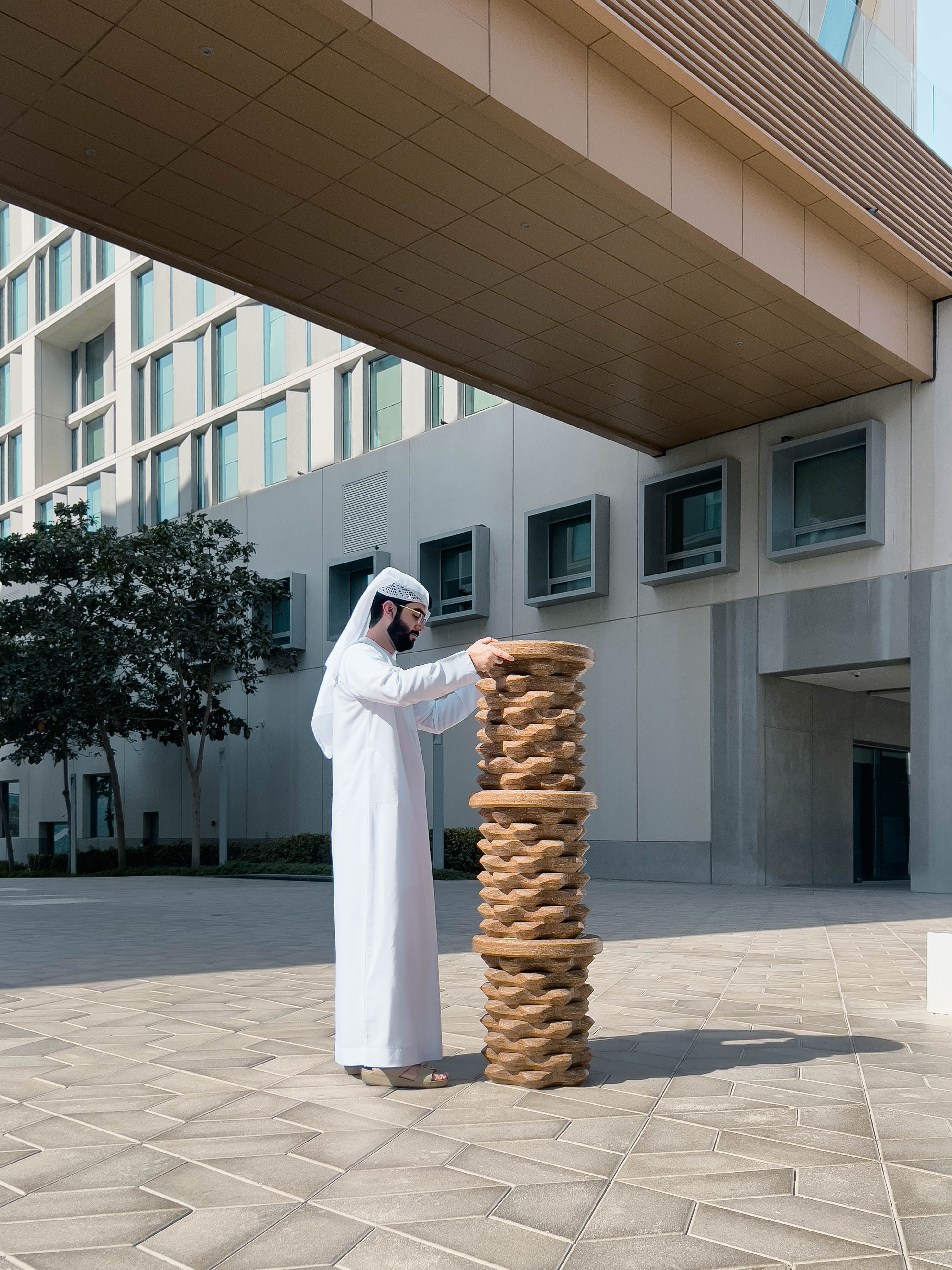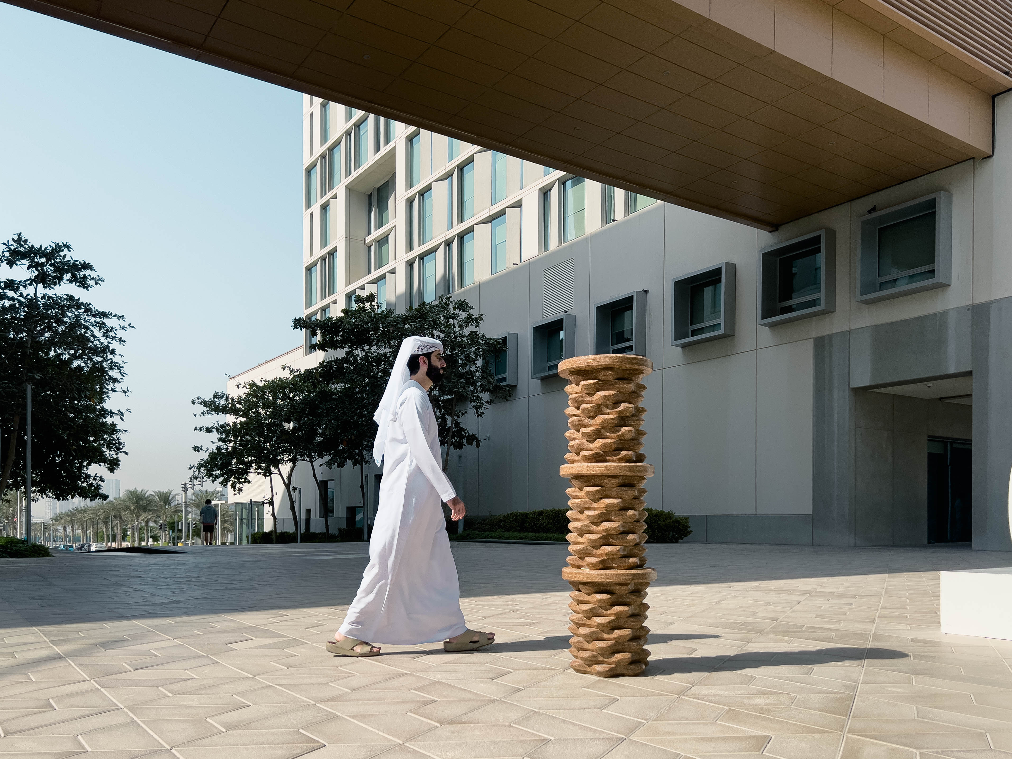 The Nakhla Stool, commissioned by Mubadala and the Abu Dhabi Department of Culture and Tourism, is a set of furniture pieces designed to fully embody the Date Palm Tree. Its form is inspired by the palm trunk’s texture and geometric motifs in Arabic architecture, while its materiality is derived from the date palm itself: Khoos, handcrafted by an artisan, and DesertBoard, a locally produced engineered wood made out of waste palm fronds. The stools are as versatile as the Date Palm in functionality, activating social spaces as individual seats (1 stool), standing tables for events (2 stools), and serving as a sculptural piece (3 stools). The piece was first exhibited at Qasr Al Hosn and will then be showcased at NOMAD Abu Dhabi.