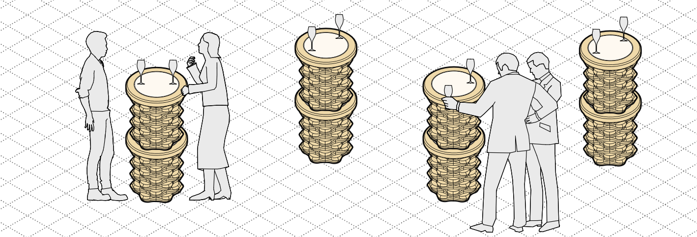 Stacking two stools on top of each other allows it to be a standing desk or cocktail table, making it suited for events.